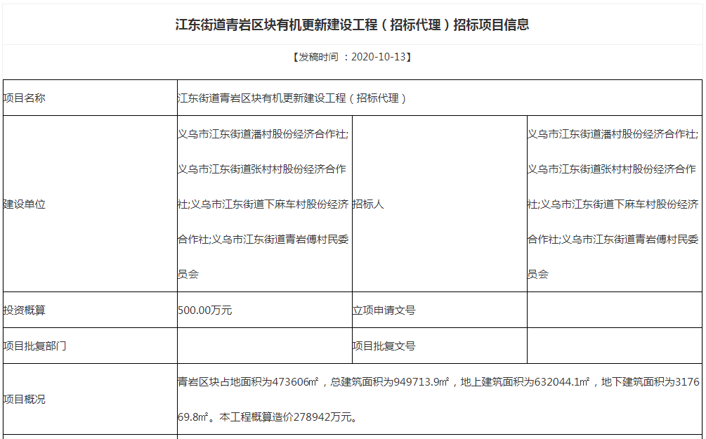 10月13日,江东街道青岩区块有机更新建设工程(招标代理)信息公示,标志着义乌江东街道“84.5号新政”试点村工作又阶段性向前推进。