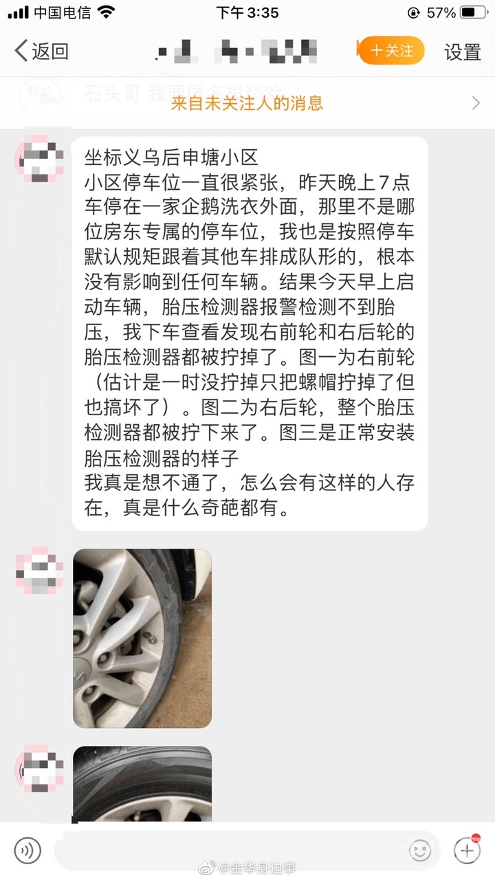 [义乌故事]义乌一网友将车停在小区,第二天胎压监测器被破坏 [复制链接]