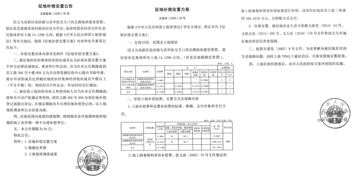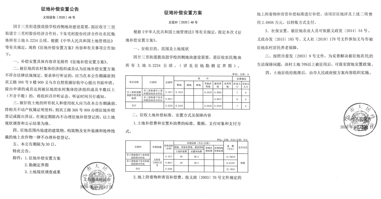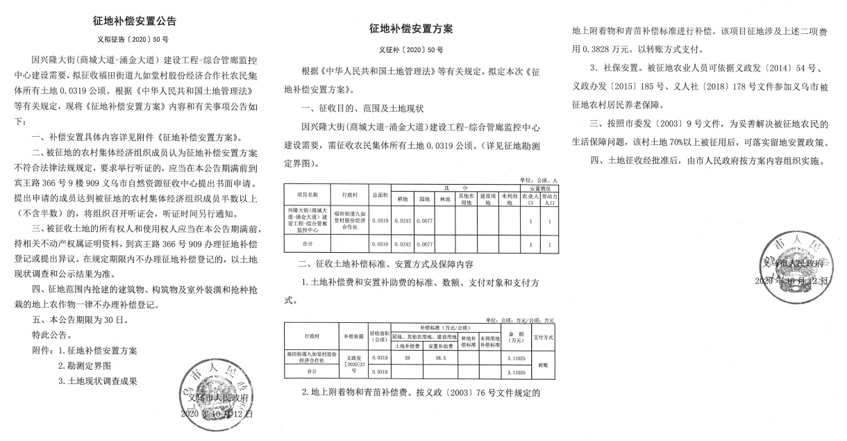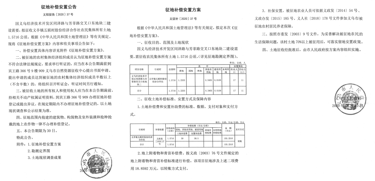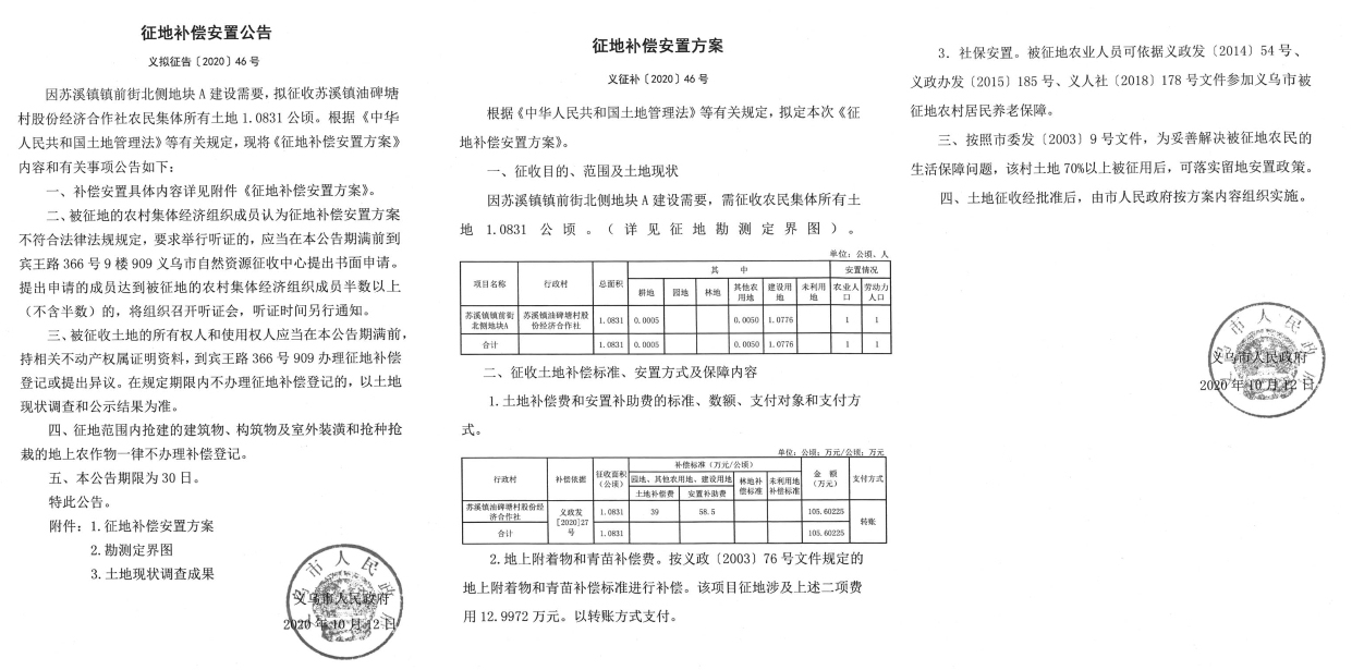 10月15日,义乌市自然资源和规划局新发布了一波有关征地补偿安置方案公告。