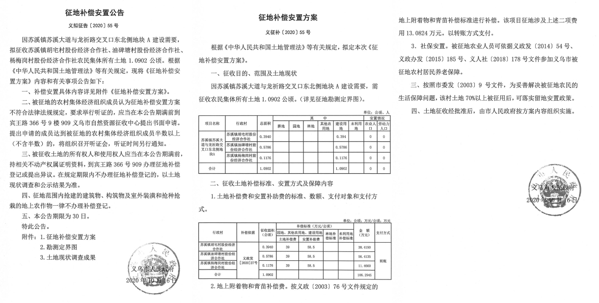 继上周市自然资源和规划局公布了一批征收安置方案后,本周一(10月19日),义乌市自然资源和规划局再次发布了多封关征地补偿安置方案公告。