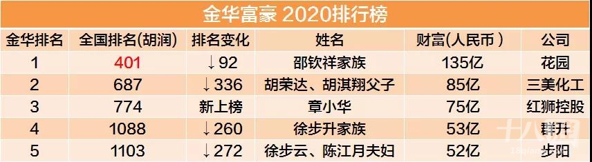 金华地区的上榜富豪,前三排名分别是花园集团的邵钦祥家族、三美化工胡荣达、胡淇翔父子、红狮控股的章小华。