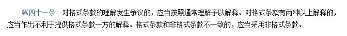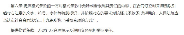 我当时我在网上查了《合法法解释二》第六条规定,提供格式条款的一方对格式条款中免除或者限制其责任的内容,在合同订立时采用足以引起对方注意的文字、符号、字体等特别标识,并按照对方的要求对该格式条款予以说明的,人民法院应当认定符合合同法第三十九条所称“采取合理的方式”。提供格式条款一方对已尽合理提示及说明义务承担举证责任。