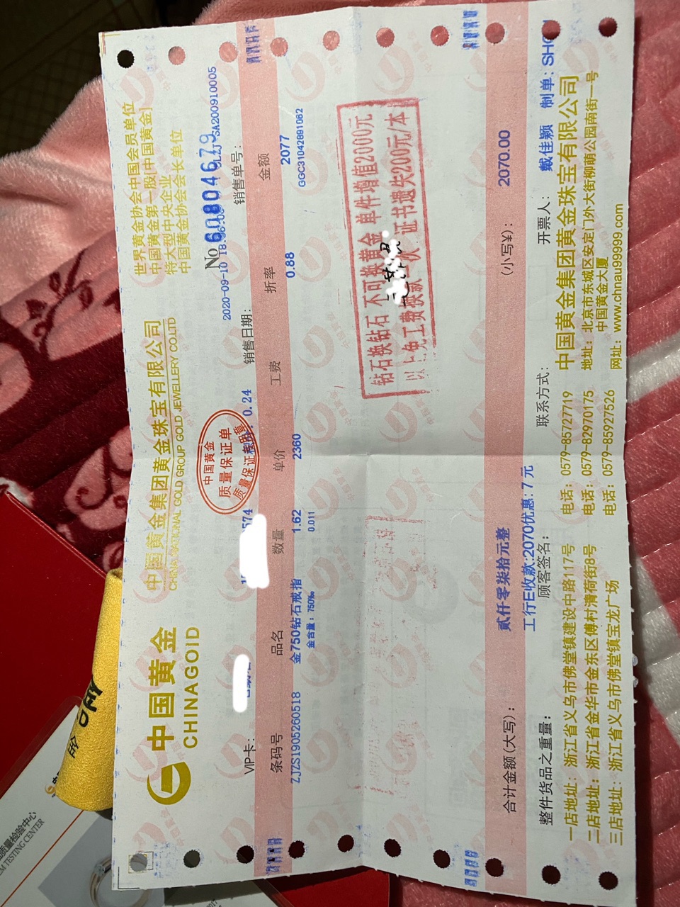 9月份去买戒指价格两千左右店员就给我介绍将近两千砖石戒指 付钱开单的时候盖了一个章跟我说了章上的内容“