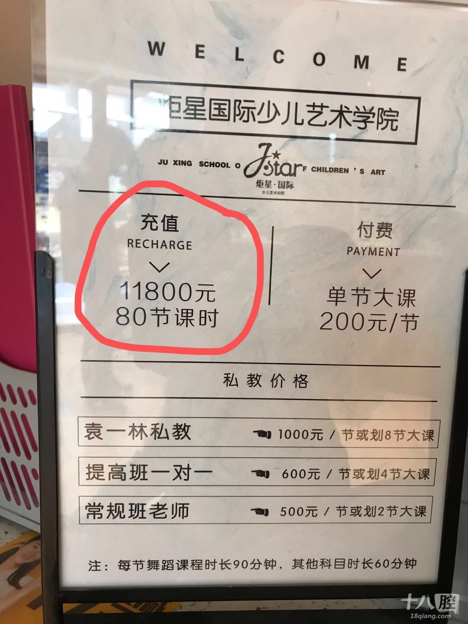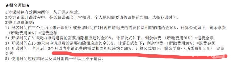 今年1月份在北苑炬星国际街舞培训报了80个课时,共计11800元,平均下来是148元/课时。暑假期间去跳了几节课,下半年因为孩子上初二了,没有时间再去跳,所以申请了退余下的课时。按她们的退款细则,减掉已经使用的35个课时,余下的学费退一半,相当于余下的学费一半是违约金,因为是我们自己原因违约,所以这一点我们没有异议。但是已经使用的35个课时炬星说要按300/课时上,也就是余下11800-35×300=1300元  再退一半就是650元!