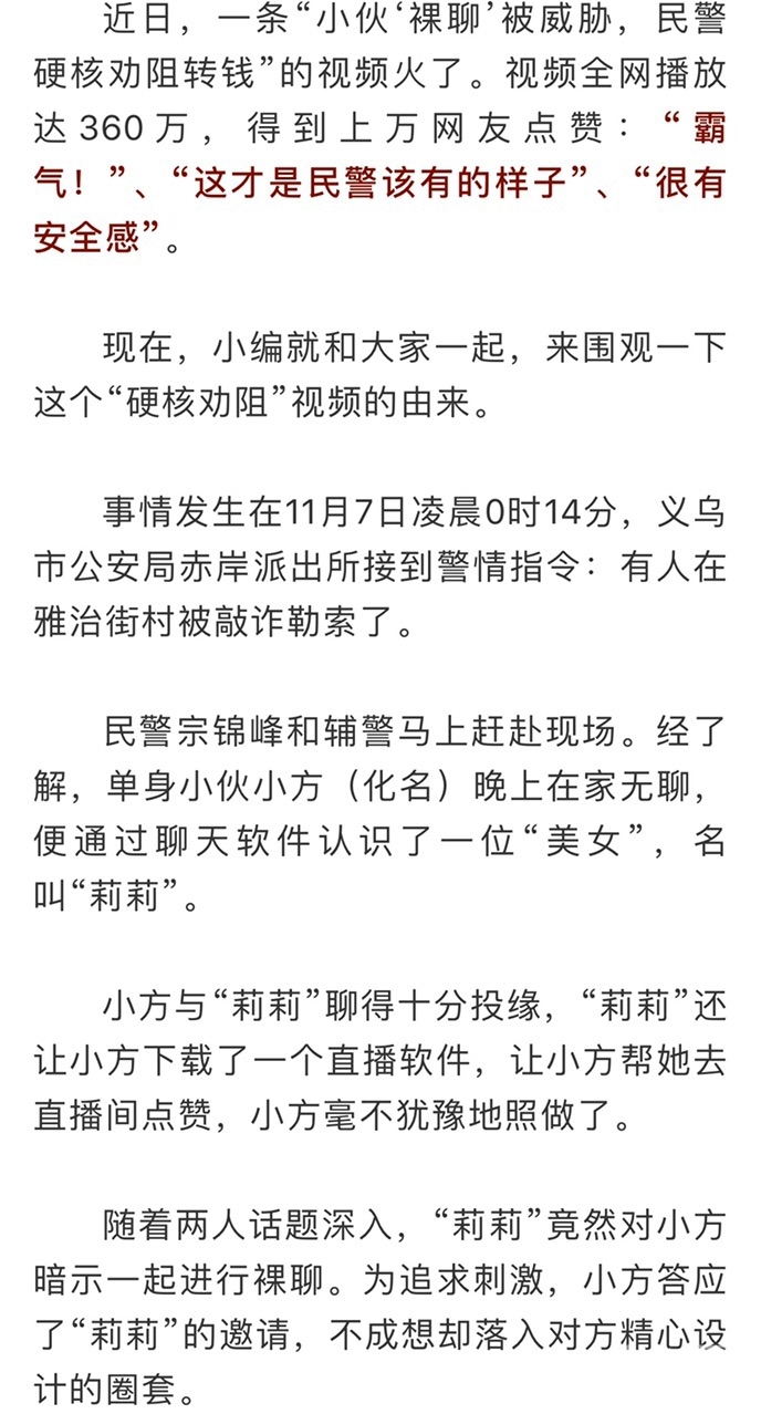 男子“裸聊”后被威胁!义乌民警霸气出手...
