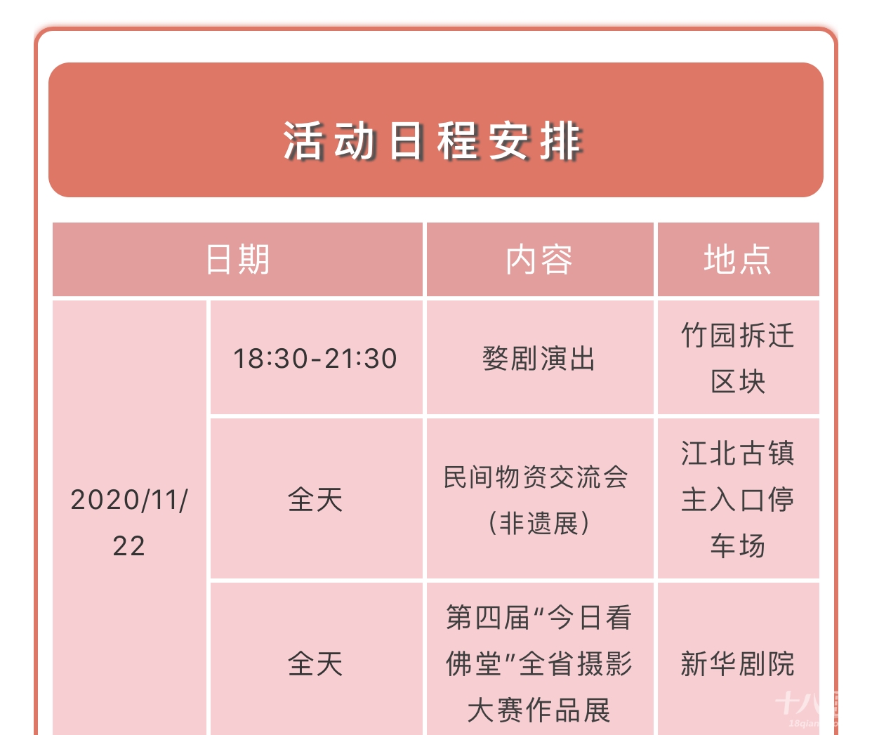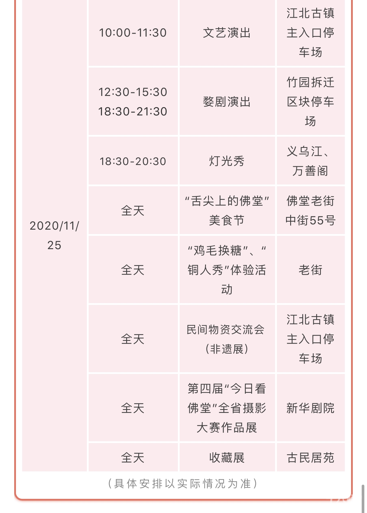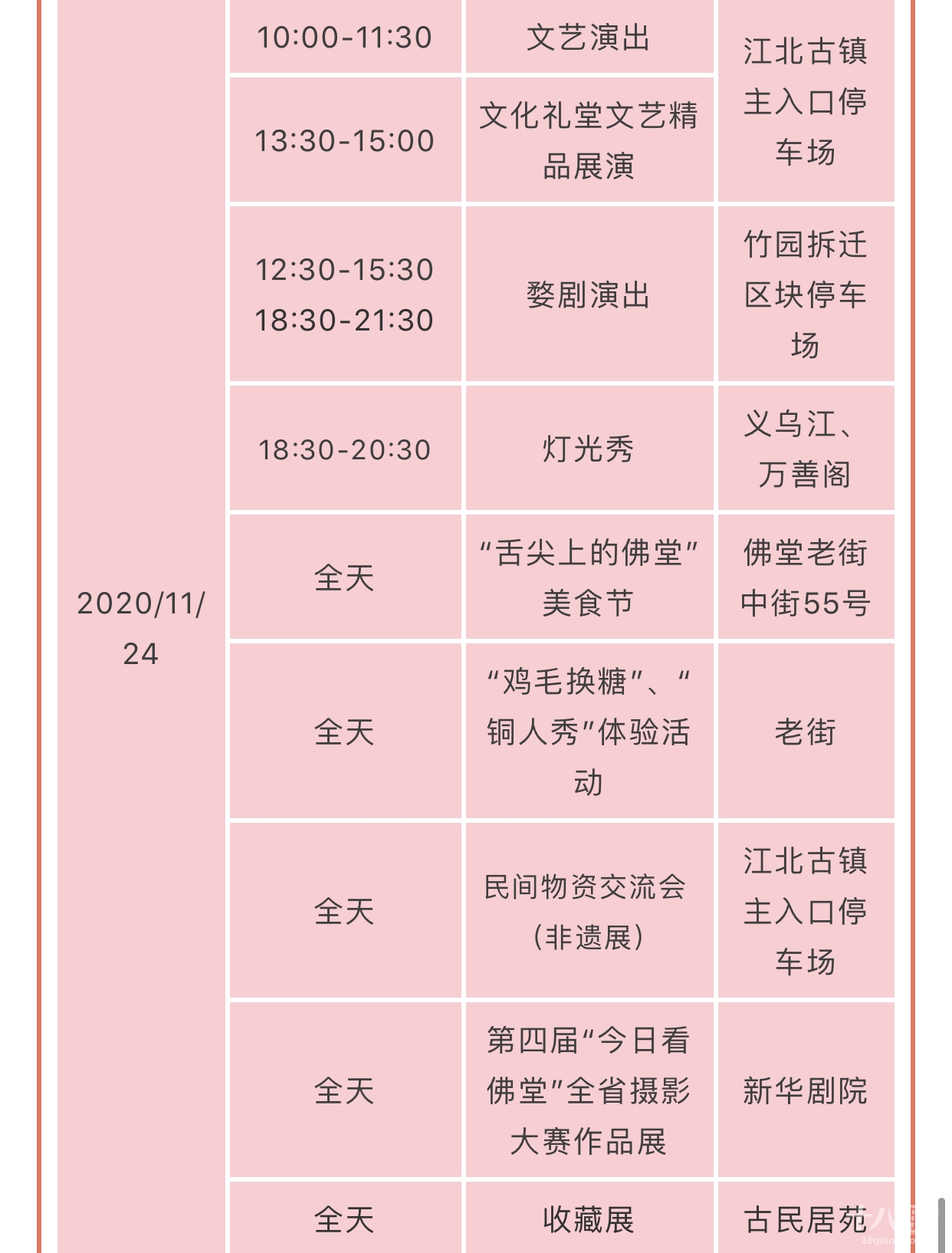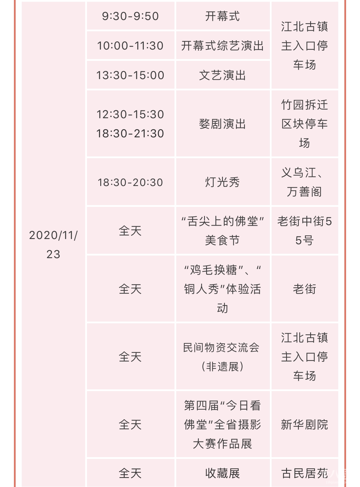 记忆里的巧什物件 热闹的非遗综艺演出 以及逐渐淡化的风趣民俗等 都将一一重现 重拾佛堂老底子记忆 本次文化节为期4天,即11月22日—11月25日(农历十月初八至十月十一)。佛堂“十月十”已经有80多年历史了,从原来单一的商品交流会,发展成了现在集综合商业、地方产业、传统文化和民间才艺于一体的盛会。佛堂“十月十”还被列入义乌市第二批非物质文化遗产代表名录,从2008年开始,传统的庙会已升格为区域性的民俗文化节,既圆了百姓乡愁,也充分展现佛堂深厚的历史文化底蕴和独特的旅游资源。“十月十”是佛堂人心中的乡愁 一场堪称历史级、现象级的 文化节即将盛启 你,准备好了吗? 01物资交流盛宴 “十月十”交流会上应有尽有 大到家具木器 小到日用百货、衣服鞋帽、副食品 约上亲朋好友,边走边逛 不用吃土也能愉快地买买买 交流会期间,非遗民俗经营及展示单位将在江北古镇入口停车场,现场制作、表演并展销非遗产品,一睹义乌剪纸、百子灯制作技艺、捏面人、泥塑等地方传统手工技艺风采。02民俗文化盛宴 在“十月十”民俗文化节期间 非物质文化遗产——婺剧 将在竹园拆迁区块上演 戏迷朋友们,搬上小马扎 期待演出开幕吧~ 11月23日—25日,收藏爱好者一定不能错过古民居苑的收藏展,此外,老街也会有“鸡毛换糖”“铜人秀”体验活动,要和小编来一场偶遇么03梦幻灯光盛宴 当夜幕降临,华灯初上 古镇开启夜的精彩  义乌江畔、万善阁上精心打造的灯光秀,流光溢彩、璀璨夺目。灯光流波点亮了夜的黑,在这光影变幻中,感受古镇不一样的美。值得注意的是在2020佛堂“十月十”民俗文化节来临之际伏虎桥泛光照明亮灯了除了伏虎桥泛光夜色之外,佛堂镇还对东风河(大成路到建设路段)、清润路夜景灯光进行了改造提升,这些美景将在今年的十月十民俗文化节上全部亮相!   看过古镇的动态美(灯光秀),在新华剧院里展出的的第四届“今日看佛堂”全省摄影大赛作品展,将带领大家领略古镇的静态美,摄影师用色彩和镜头讲述了古镇的秀美风光和人文、生态景观,呈现出静谧而美好的生活。   04饕餮美食盛宴 对于“吃货”们来说 有吃的地方就是“天堂” 小编作为资深吃货,“舌尖上的美食”项目必须榜上有名。麻糍、豆腐脑、梨膏糖、荞麦老鼠......(小编一边打字一边要流口水了)这些传统的美食将在这里一一展现,满足你的味蕾,承包你的胃plus!  美食节上,你还有机会看到东河肉饼、豆腐包、炸响铃、牛杂汤等本土传统美食的纯手工制作过程,找寻义乌老底子味道,说不定还能学上两手,把美味带回家。05出行早知道 “十月十”民俗文化节期间,活动多样,人流车流量较大,为避免造成大面积拥堵,保证道路通行秩序,请广大驾驶员按指示标识行驶,自觉服从执勤人员指挥,对于违停车辆,交警蜀黍可不会留情哦!小编如此贴心怎会没有出行攻略图(点击放大查看图片) 心动不如行动 11月22日—25日,来佛堂 我带着你,你带着钱 咱一起去“逛吃逛吃逛吃”吧~ ▼▼▼▼▼ 来源丨义乌市融媒体中心作者 | 施晓婷