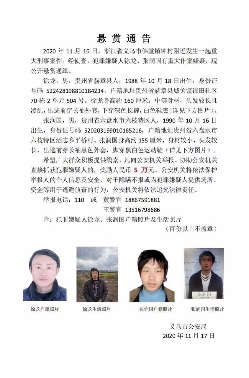 11月16日,义乌佛堂镇钟村附近发生一起重大刑事案件,经警方侦查,犯罪嫌疑人徐龙、张润国有重大作案嫌疑。