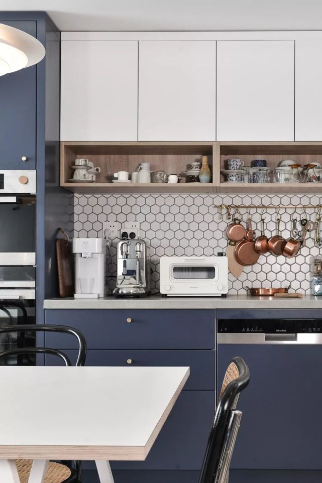 吊柜下面设计的开放式展架可用于收纳杯子和餐具等用品,