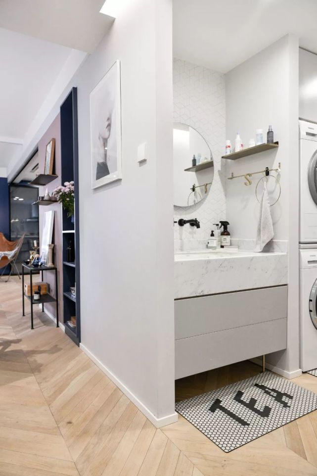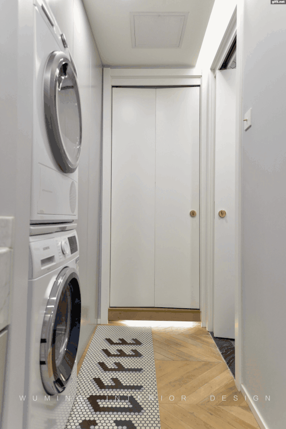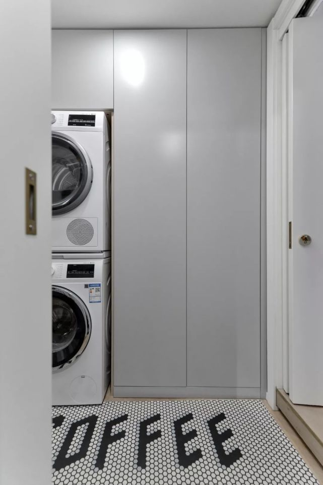 走廊一侧布置了洗手台+储物柜+内嵌洗衣机&烘干机。