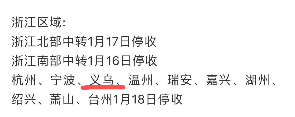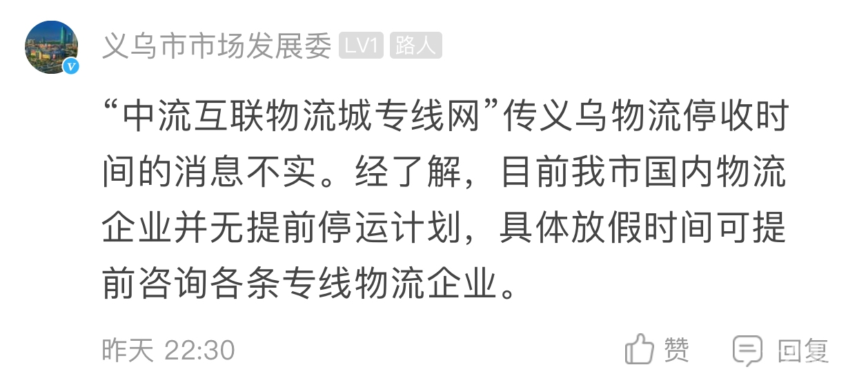 近日, 中流互联物流城专线网”传义乌物流1月18日停收 义乌市市场发展委回复:“中流互联物流城专线网”传义乌物流停收时间的消息不实。经了解,目前我市国内物流企业并无提前停运计划,具体放假时间可提前咨询各条专线物流企业。