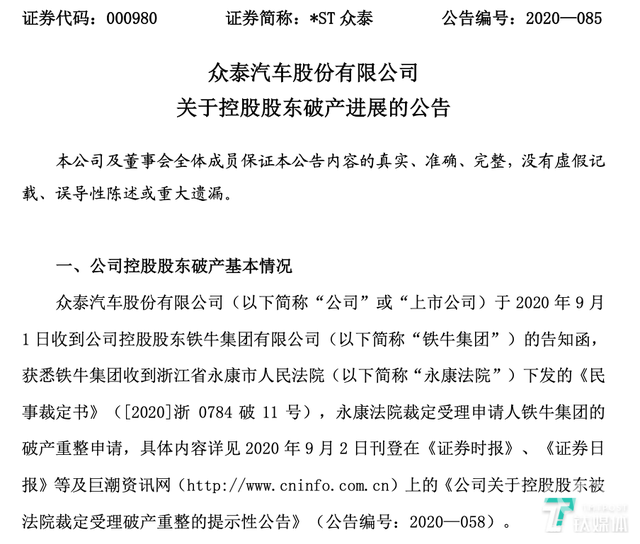 随后,众泰汽车表示公司与铁牛集团在资产、业务、财务等方面均保持独立, 公司目前主要业务处于停产状态,不会对公司日常经营造成重大影响。铁牛集团破产后续处置可能会引起本公司实际控制权的变化。