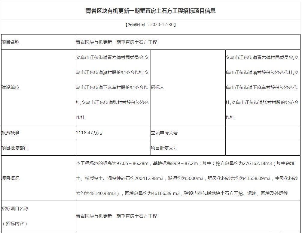 12月30日,后宅街道全备村农村有机更新建设工程项目管理和青岩区块有机更新一期垂直房土石方工程招标信息进行了公布。