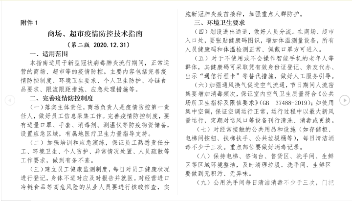 1月5日,商务部办公厅印发《商场、超市疫情防控技术指南》等4个防控指南的通知,请各省、自治区、直辖市、计划单列市及新疆生产建设兵团商务主管部门督促指导商贸流通企业做好相关疫情防控工作。
