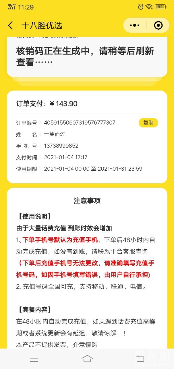 在一个十八腔优选里参加了一个143元充150元话费活动,结果48小时了还没到帐,在我充值了十八腔优选商城里可以查到订单,在十八腔的十八腔商城里又查不到这个订单,十八腔优选到底有几个商城啊