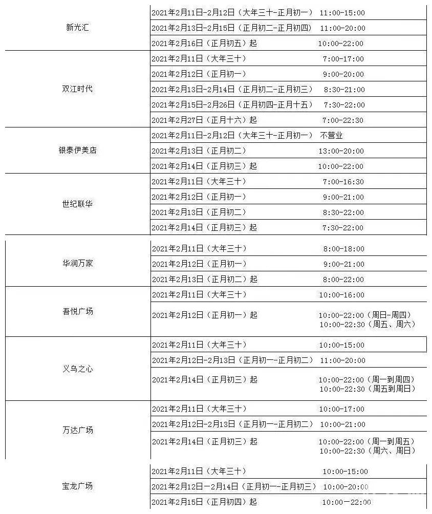 义乌之心、新光汇、万达……春节关门吗?营业安排表收好