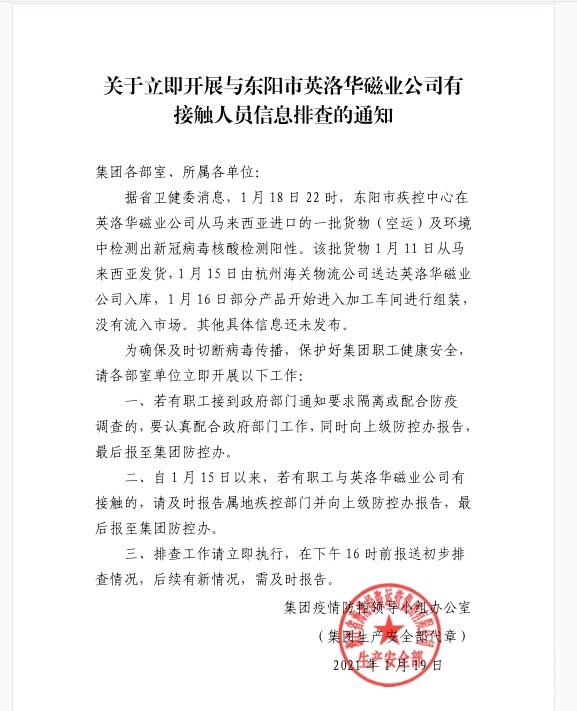 东阳市立即启动疫情防控应急响应,及时将该信息通报相关部门单位,第一时间封闭涉疫仓库及车间,封存相关配件,对该企业及周边环境进行全面管控和消毒,对企业仓储、生产等员工及相关接触人员进行集中隔离医学观察,对上述人员和企业全体员工开展核酸检测,检测结果均为阴性。