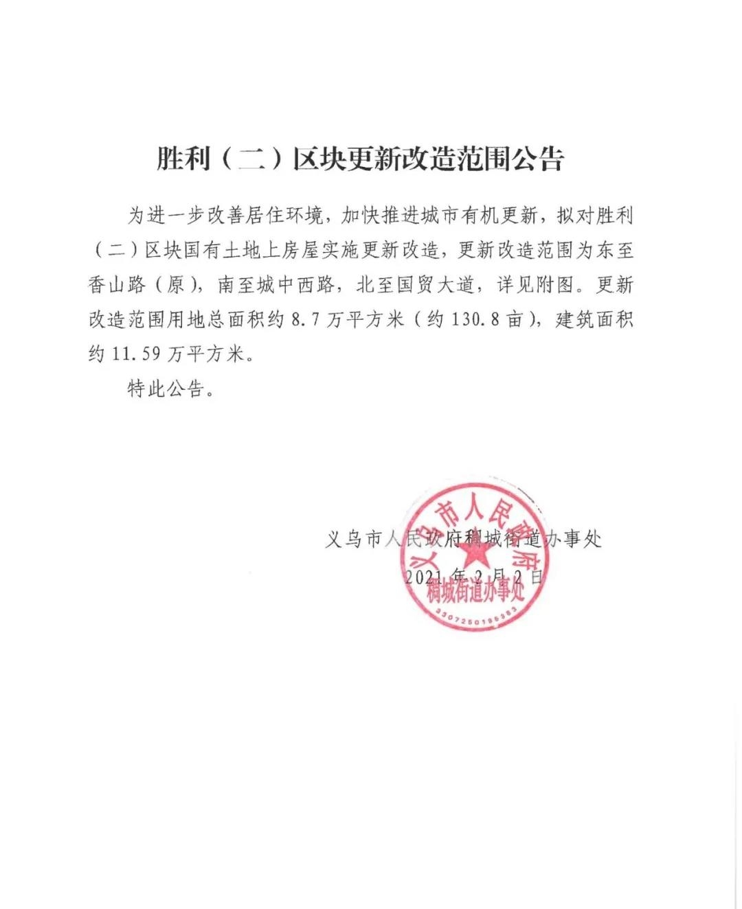 2月2日,义乌市人民政府稠城街道办事处发布胜利(二)区块更新改造范围公告。
