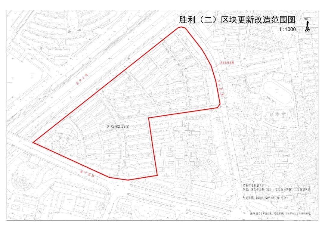 公告称:为进一步改善居住环境,加快推进城市有机更新,拟对胜利(二)区块国有土地上房屋实施更新改造,更新改造范围为东至香山路(原),南至城中西路,北至国贸大道,详见附图。更新改造范围用地总面积约8.7万平方米(约130.8亩),建筑面积约11.59万平方米。