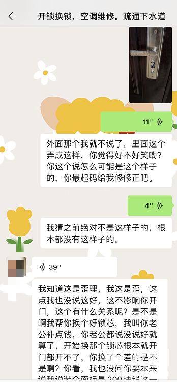 差不多半个多月的样子这个锁中途坏了两次,一次我自己解决掉了,都是里面没人,根本没有反锁过但是钥匙就是打不开门,昨天又开不进去了,我联系他的时候,他就断定说我自己里面反锁了我说没有人不可能反锁掉的,他非说是,我说让他来看一下,他找了个人给我打电话说看一下80块钱,我说你刚装的就坏了怎么还要我掏钱,他就把我电话给挂了,一直挂,后面我就发他微信理论,后面就开始骂起我来了,说一些脏话之类,还说我没钱别开锁什么的。