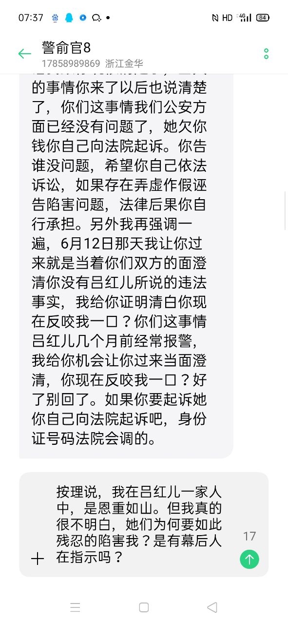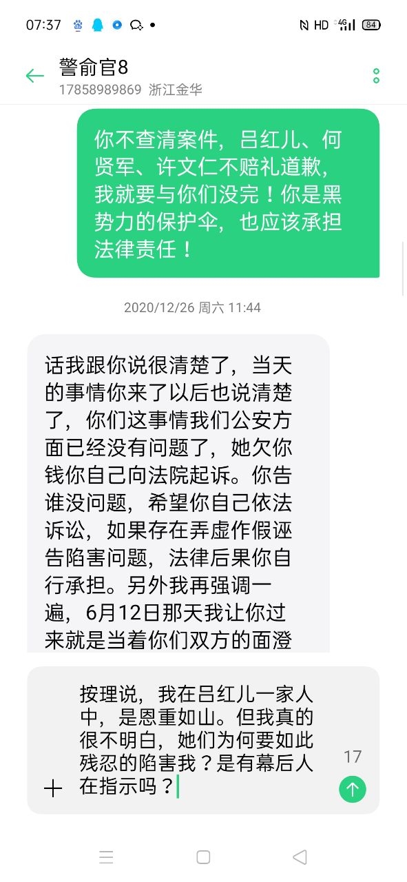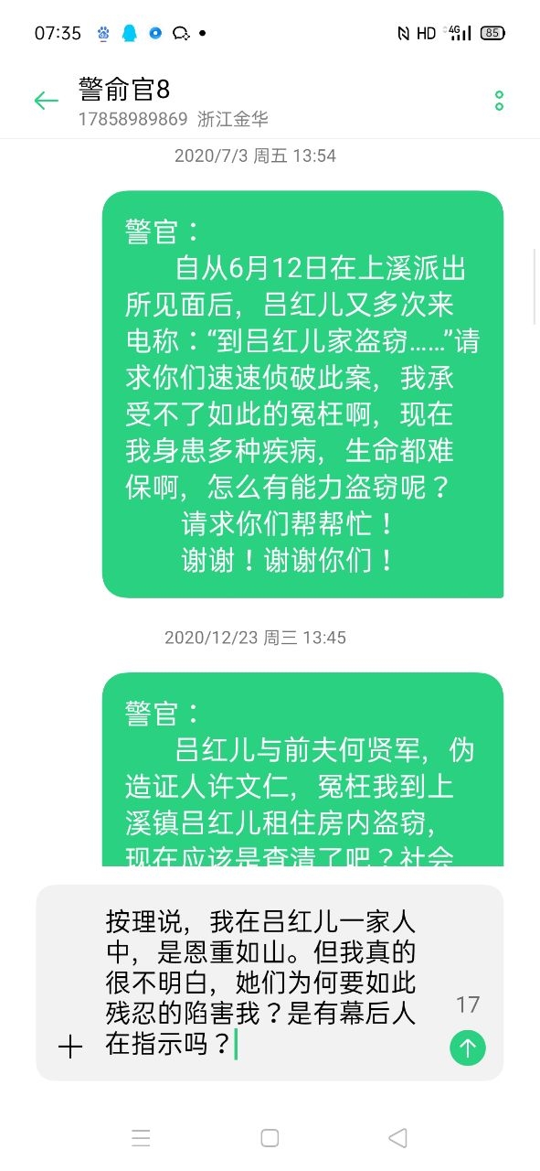 吕红儿、何贤军到上溪镇派出所报假案,伪造证据证人许文仁冤枉我到上溪盗窃、暗装隐形监控,这恩将仇报、借刀杀人的行为,完全是犯罪的行为,至今都未有破案的结果给我,傅、俞警官电话拒接。
