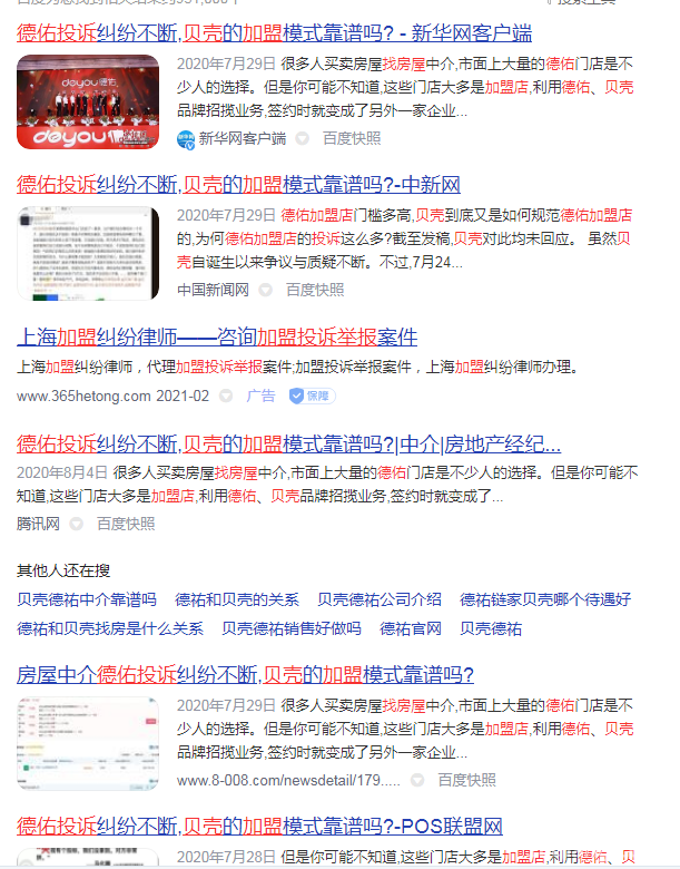 去年年底前打算加盟贝壳找房德佑中介加盟,和他们对接了之后,按照他们的流程我们都准备好了,他们说同样的店面后面加盟要相隔100米距离。过完年之后,他们就反悔了,在我们选好的位置让另外一家中介加盟,中间相差10米左右,说两家可以一起做用一样的门头。我就想问下贝壳找房德佑加盟一点诚信都没有吗?答应的事情说反悔就反悔,我们去他们公司沟通,说是业务员自己的问题,我就问下业务员不是代表公司的吗?出了问题就甩锅业务员,一句话就带过去了,看来并不是大公司就有诚信,大家一定要擦亮眼睛,慎重!慎重!慎重!不讲信用的公司是可悲可怜可恨的,也是可怕的