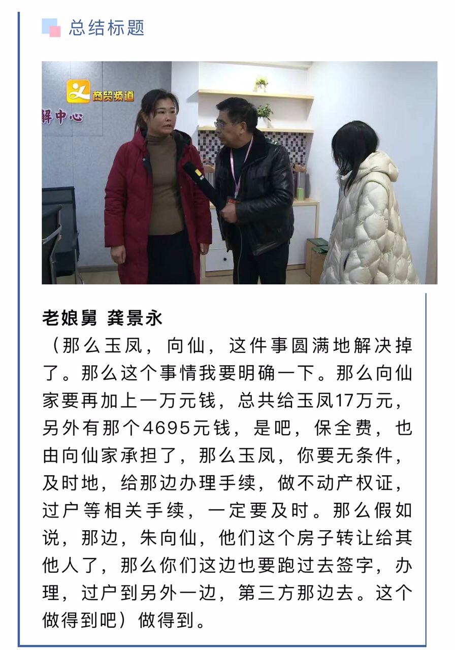 佛堂人丁予亮在2019年5月将自家的一套权益房转让给了朱向仙,如今房子要签字过户,丁予亮的妻子宋玉凤提出要加价二十多万,买卖双方因此闹出了矛盾。为处理好这件事,他们找到了我们栏目的老娘舅龚景永。