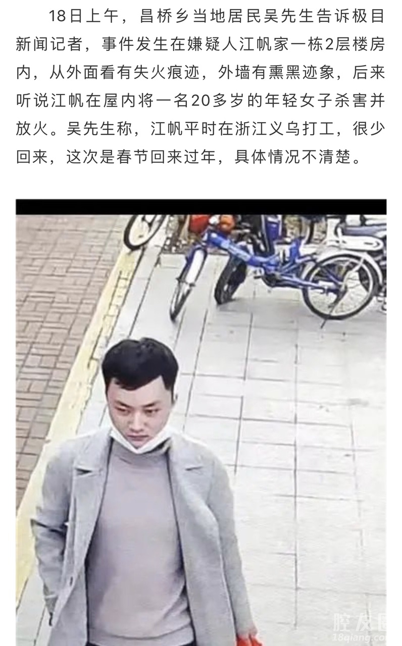 2月16日,2月17日,安徽省宣城市泾县公安局两次发布悬赏通告,2月15日晚当地昌桥乡新陇村中塘组发生一起重大刑事案件。经侦查,新陇村居民江帆(男,1996年12月2日出生)有重大作案嫌疑。