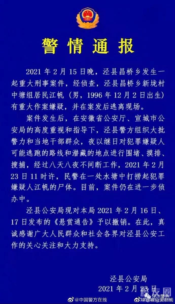 随后,泾县公安经过八天八夜不间断工作,2月23日11时许,在一处水塘中打捞起犯罪嫌疑人江帆的尸体。目前,案件仍在进一步侦办中