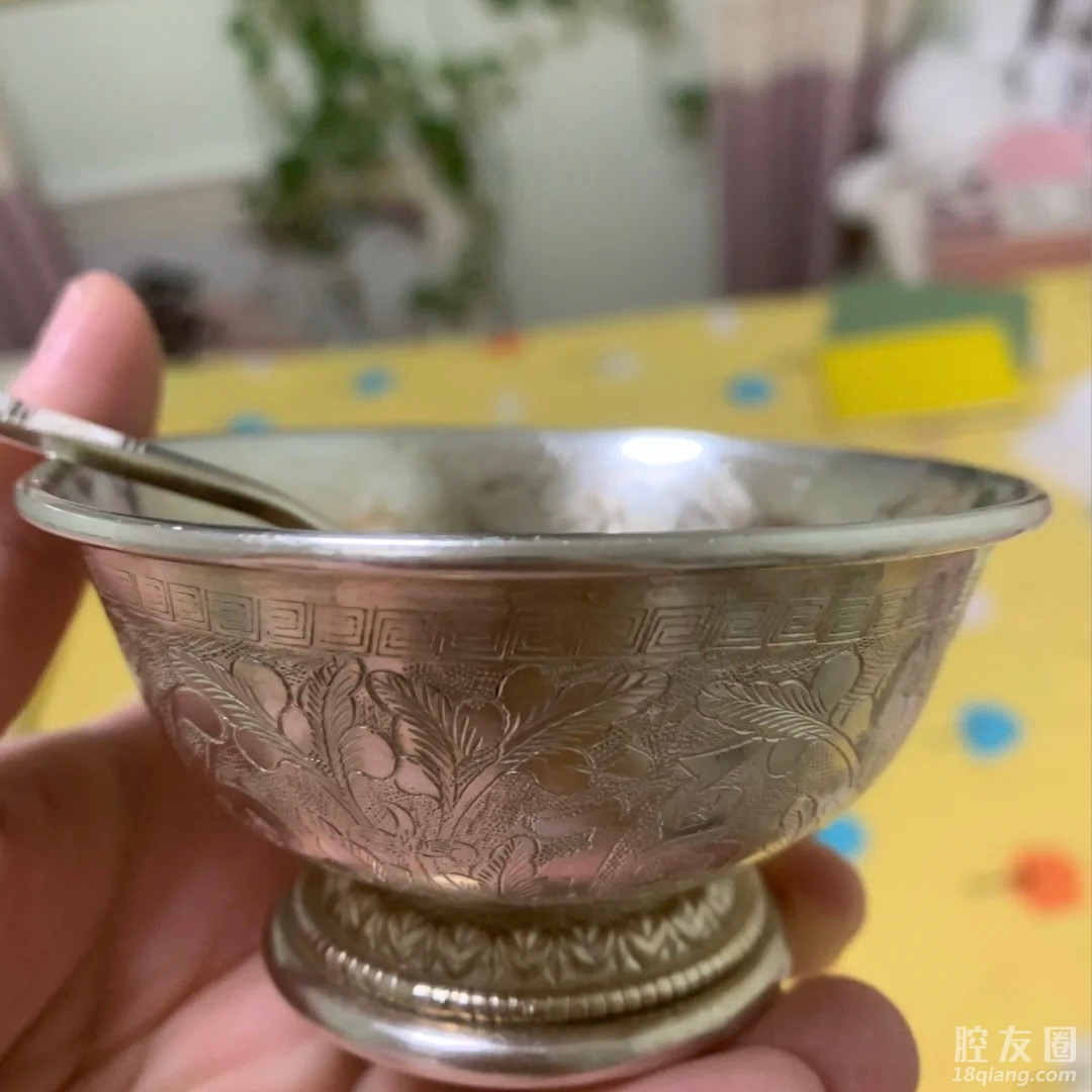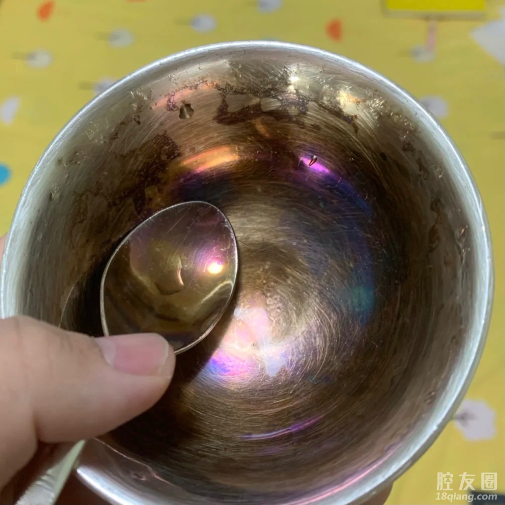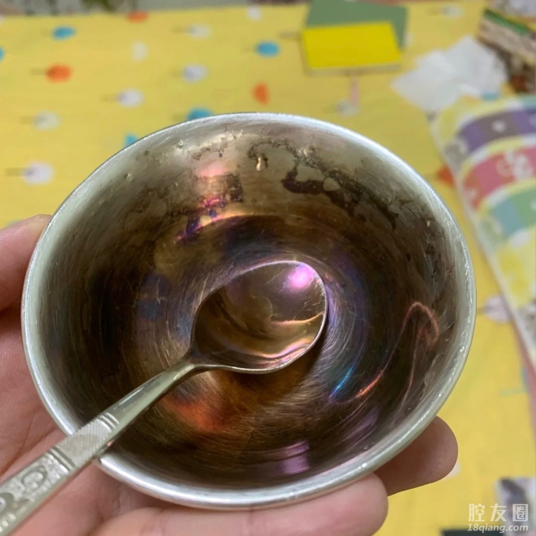 外公外婆给娃买的银碗银勺子,最近他们来看娃就拿出来用下 以前没用过 最近装辅食变成这样了 好恐怖 这是表示有什么有毒吗?
