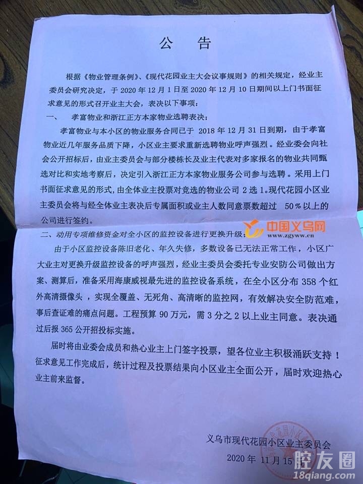 “我们也保留了孝富物业的竞聘权利,最终综合考虑后在四五家物业公司中筛选出了浙江正方本家物业服务有限公司(以下简称“正方物业”),与孝富一起,让业主二选一。”吴先生说,业委会2020年9月函告了孝富物业,11月15日向全体业主发布了相关公告,并于12月1日上门让业主签字投票。