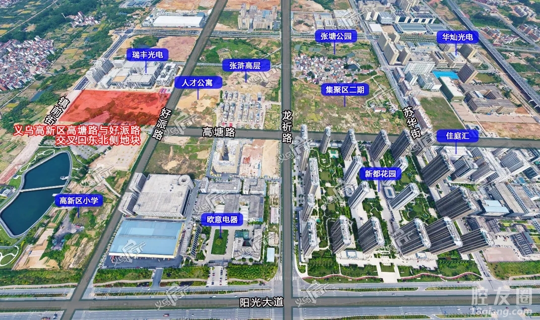 地块周边交通路网发达,纵向有阳光大道、春风大道可快速通达福田江东及大陈板块。横向有好派路、龙祈路等道路可深度串连起与苏溪镇区的联系。镇域交通“六纵十横”大框架已形成。 其他方面,地块北侧有义乌高新区小学,性质为公立学校,定位为全日制小学、幼儿园。办学规模为小学设置36个班,幼儿园20个班(含两个托班)。