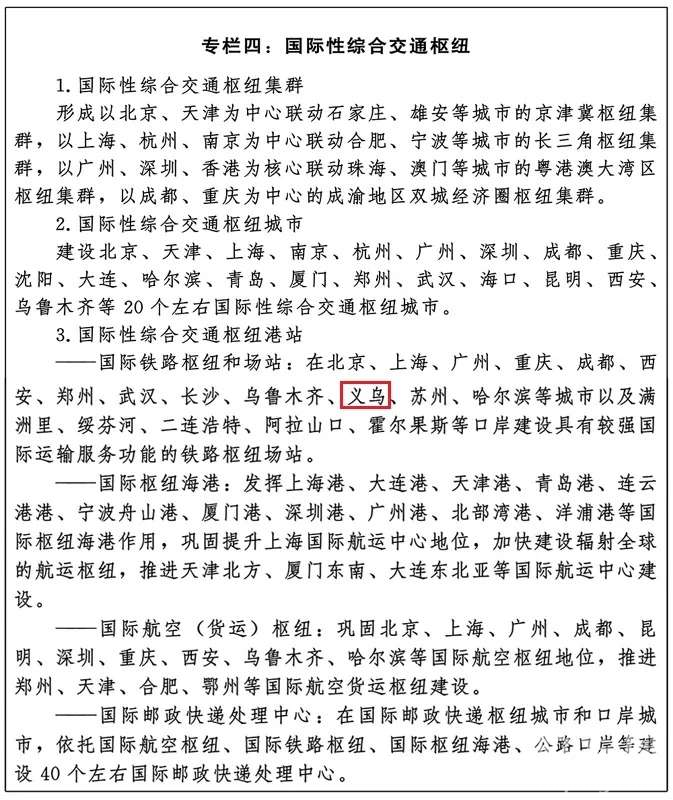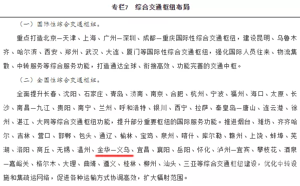 全国性综合交通枢纽城市的具体名单,在国务院2017年印发的《“十三五”现代综合交通运输体系发展规划》已经明确。该规划将综合交通枢纽分为国际性、全国性和区域性等3类,提出推进金华—义乌等全国性综合交通枢纽建设,优化中转设施和集疏运网络,促进各种运输方式协调高效,扩大辐射范围。