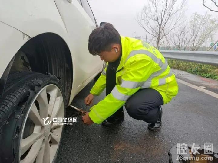 3月11日下午,义乌的任女士驾车前往金华办事。14时30分许,途经G1512甬金高速往金华方向佛堂路段时,任女士发现车辆胎压不足的故障灯亮了,于是就近在佛堂收费站下了高速。原来是车辆右后轮炸胎,无法继续行驶。正当束手无策准备打电话给家里人时,任女士看见刚好巡逻到此的警车,立即上前示意求助。了解情况后,车上的四大队辅警赵夏伟二话不说,利索地换好了轮胎,边换边提醒任女士注意事项以及操作方法。据任女士称,她从义乌廿三里出发前往金华办事,发现故障以后,回忆起平时在新闻中看到的高速交警安全宣传,知道逗留主线太危险,见佛堂收费站就在眼前,果断坚持开到收费站外广场。