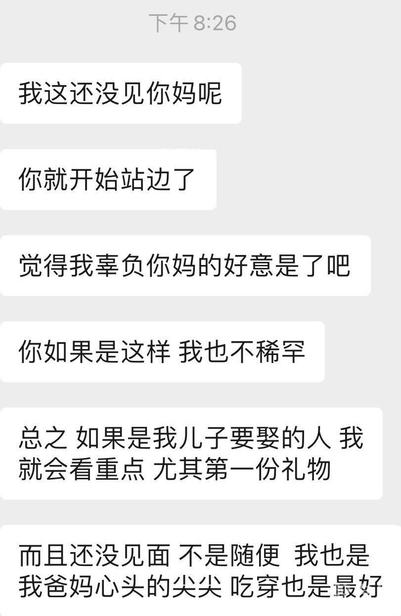 她拿到之后一直在说是什么啊要查一下多少钱,以后好还,我说不用,就是零食是给她吃的,小心意,她就生气了,她觉得我妈没见过她,第一次送这样的东西不重视她,还说我没引导我妈送点好的,因此气炸了和我吵架,我就分手了,我觉得我们不是一路人