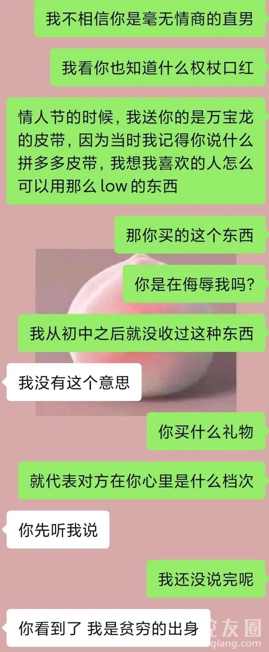 谈恋爱三个月,情人节我送了万宝龙的皮带,代购不到一千五。他啥也没送。谈之前,我也经常给他买小礼物,他只会给我点杯奶茶。