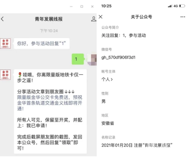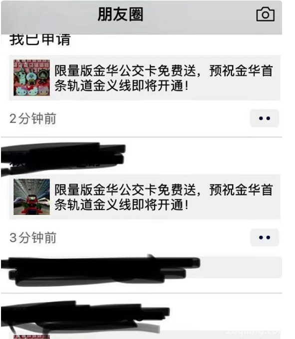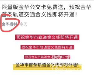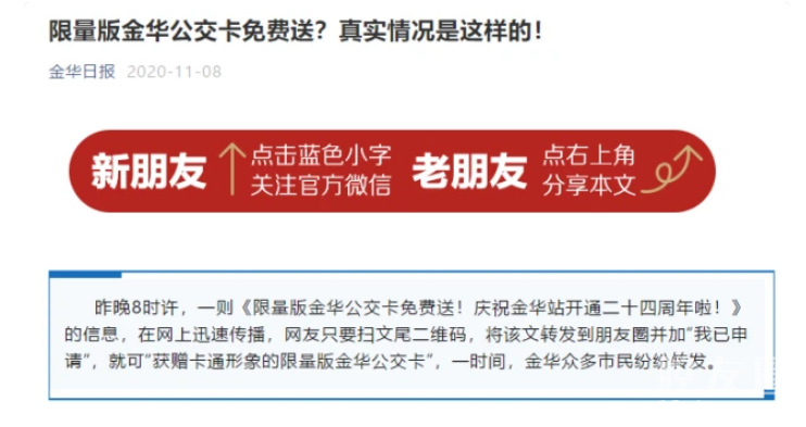 2021年3月19日晚,一则《限量版金华公交卡免费送,预祝金华首条轨道交通金义线即将开通!》的信息,在网上迅速传播,网友只要扫文尾二维码,将该文转发到朋友圈并加“我已申请”,就可“获赠卡通形象的限量版金华公交卡”,一时间,众多市民纷纷转发。