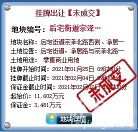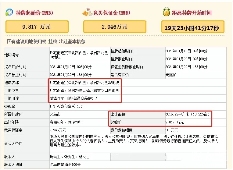 今年1月5日,义乌市自然资源和规划局发布义土挂〔2021〕2号出让公告,该地块以11602万元起价挂牌出让,起始楼面价11346元/平方米。2月4日上午9时,该地块挂牌时间截止,随后在出让页面中显示未成交,疑为无人出价导致流拍。