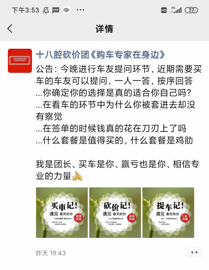 建群半个月以来,只要团长晚上有空闲的时候,晚上8:30-9:00就会在群里分享选车攻略、买车砍价技巧、为大家答疑解惑……
