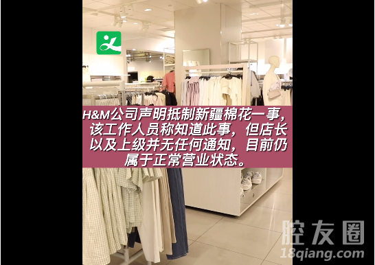记者向一位店内工作人员询问H&M公司声明抵制新疆棉花一事,该工作人员称知道此事,但店长以及上级并无任何通知,目前仍属于正常营业状态。