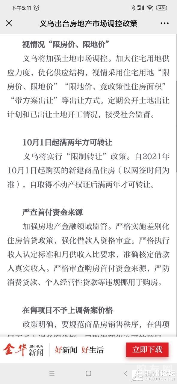 义乌将实行“限制转让”政策。自2021年10月1日起购买的新建商品住房(以网签时间为准),自取得不动产权证后满两年才可转让。