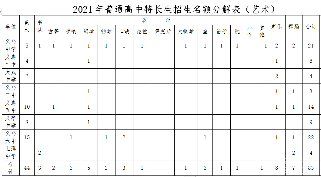 注:1.义乌中学音乐各专业如有项目出现报名及招生人数不足的情况下,名额依次优先(各一名)转给钢琴、二胡、阮、大提琴、打击乐、琵琶等紧缺专业;2.义乌中学等相关学校2022年将增加艺术类招生计划。