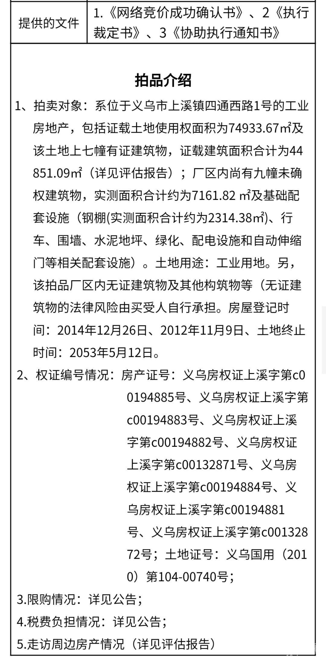 位于义乌市上溪镇四通西路1号的工业房地产,包括证载土地使用权面积为74933.67㎡及该土地上七幢有证建筑物,证载建筑面积合计为44851.09㎡(详见评估报告);厂区内尚有九幢未确权建筑物,实测面积合计约为7161.82 ㎡及基础配套设施(钢棚(实测面积合计约为2314.38㎡)、行车、围墙、水泥地坪、绿化、配电设施和自动伸缩门等相关配套设施)。土地用途:工业用地。另,该拍品厂区内无证建筑物及其他构筑物等(无证建筑物的法律风险由买受人自行承担。房屋登记时间:2014年12月26日、2012年11月9日、土地终止时间:2053年5月12日。