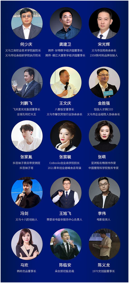 产业园领头羊龚建卫、零售巨头宋光辉、餐饮巨头王文庆、地产大王刘鹏飞、人才质检大师金胜强、袜子哥张家胤、文化之星张宸毓也将发表演讲,一同探讨义乌市场数字经济环境下的创业新风向。