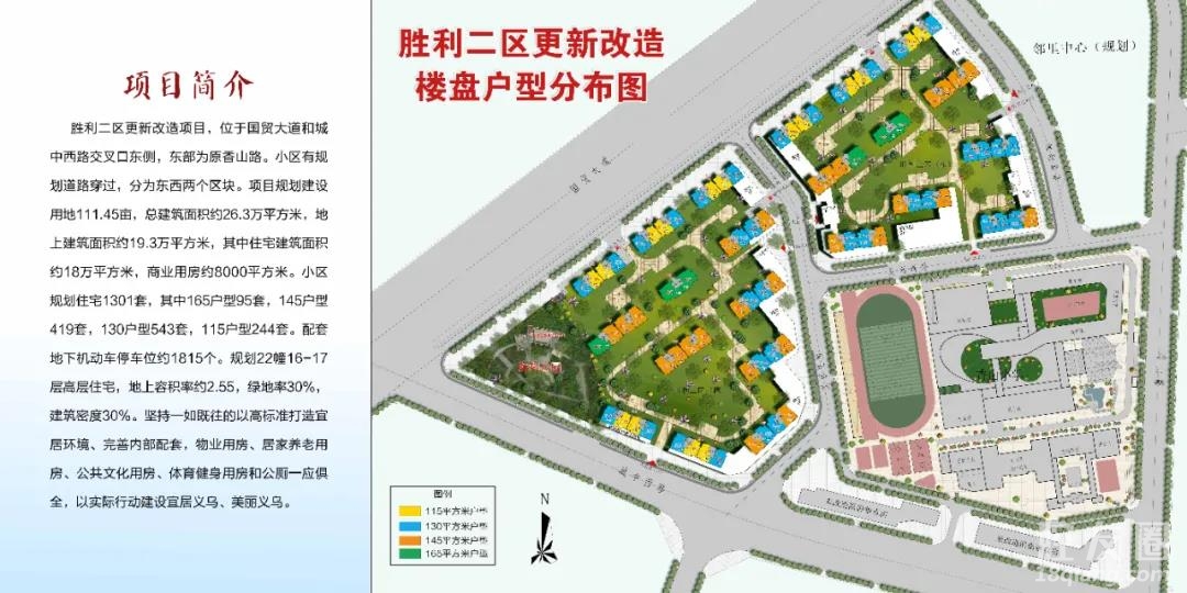 项目简介 胜利二区更新改造项目,位于国贸大道和城中西路交叉口东侧,东部为原香山路。小区有规划道路穿过,分为东西两个区块。项目规划建设用地111.45亩,总建筑面积约26.3万平方米,地上建筑面积约19.3万平方米,其中住宅建筑面积约18万平方米,商业用房约8000平方米。小区规划住宅1301套,其中165户型95套,145户型419套,130户型543套,115户型244套。配套地下机动车停车位约1815个。规划22幢16-17层高层住宅,地上容积率约2.55,绿地率30%,建筑密度30%。小编从稠城街道拿到 胜利二区更新改造 项目标准层户型图 快来先睹为快! 备注:以上户型图仅供参考,后期还可能设计优化,以最终分房为准。胜利二区更新改造 楼盘户型分布 来源丨稠城街道 义乌市融媒体中心
