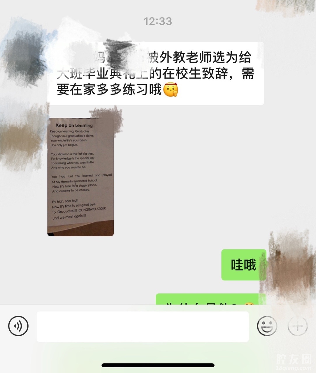 现在小朋友毕业典礼都这么高标准吗?毕业致辞全英文,不过还是很荣幸啊,哈哈,考验老母亲的时候来了,回家先自己背背书