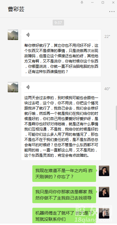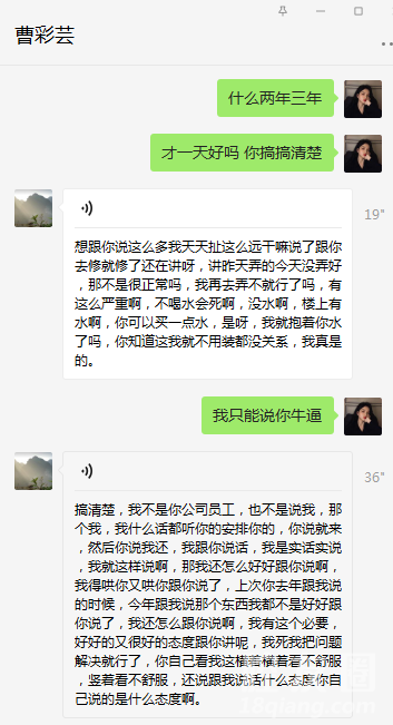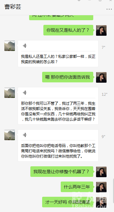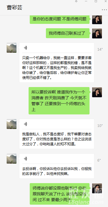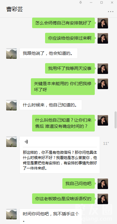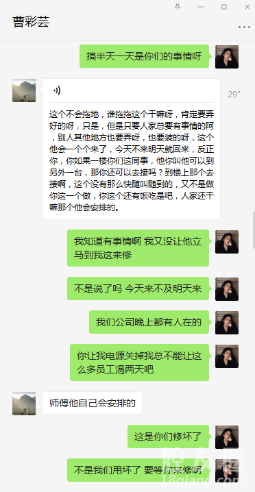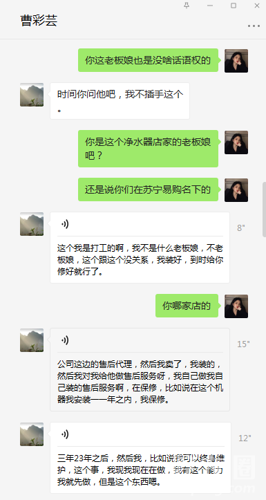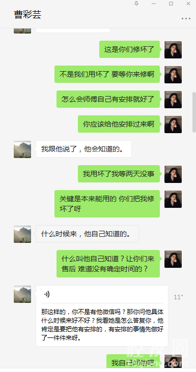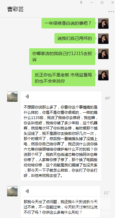 一直强调没赚钱,成本价给的我们。还要安排人来修,亏钱在帮我们更换配件。我呢不知道是不是亏本,至少我钱花了,不能让我使用几分钟就坏吧?我是消费者啊?而且跟她确认师傅何时来,她就不管事了,让我自己联系,我以为不是老板,跟她确认这家店谁做主,我好确认我这情况是否保修,是否能安排别的空闲的师傅来维修。我作为一个公司员工,把事情处理好是我的本职工作,不能因为你不管我也不管吧?结果呢,曹彩芸又承认自己是老板,又是一大堆的废话,还说我态度不好心累!