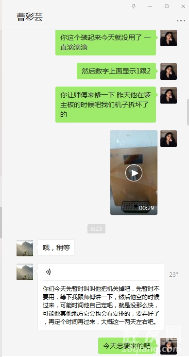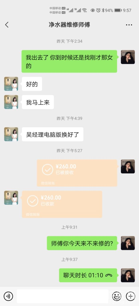 首先我联系她因为她是老板娘,其次确认时间她说不一定得几天,说师傅没时间(撒谎了,我问了师傅他说老板娘没联系他过),而且我这机器原本是能用的,师傅修坏了才让她安排人来修理,毕竟不是我们用很久了才半天时间,我不是让她立马让人来,可她呢?觉得机器卖了这么多年了,早就不在她管理范围了,可滤芯不是每年都你那买吗?主板钱不是昨天才给你吗?不是主板保修一年吗?隔天拍拍屁股就不认人了?