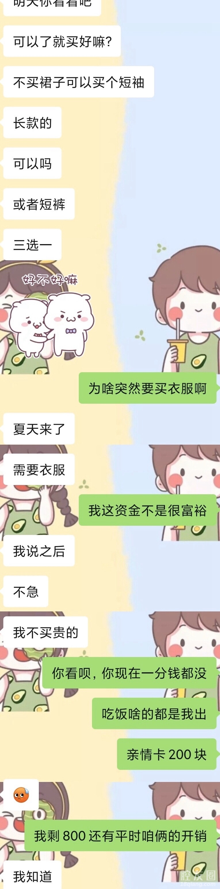 之前她让我给她买过裙子,我给了钱,后来她自己花到吃饭上去了。我直接告诉她我最近没多少钱了。因为这俩月,我俩的花销一直都是我出。大到出去旅游,小到买一瓶水,都是我出的。她没有说主动跟我分担过这个经济压力,每次都是默默的看着我付款。