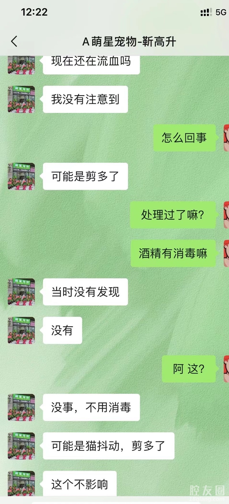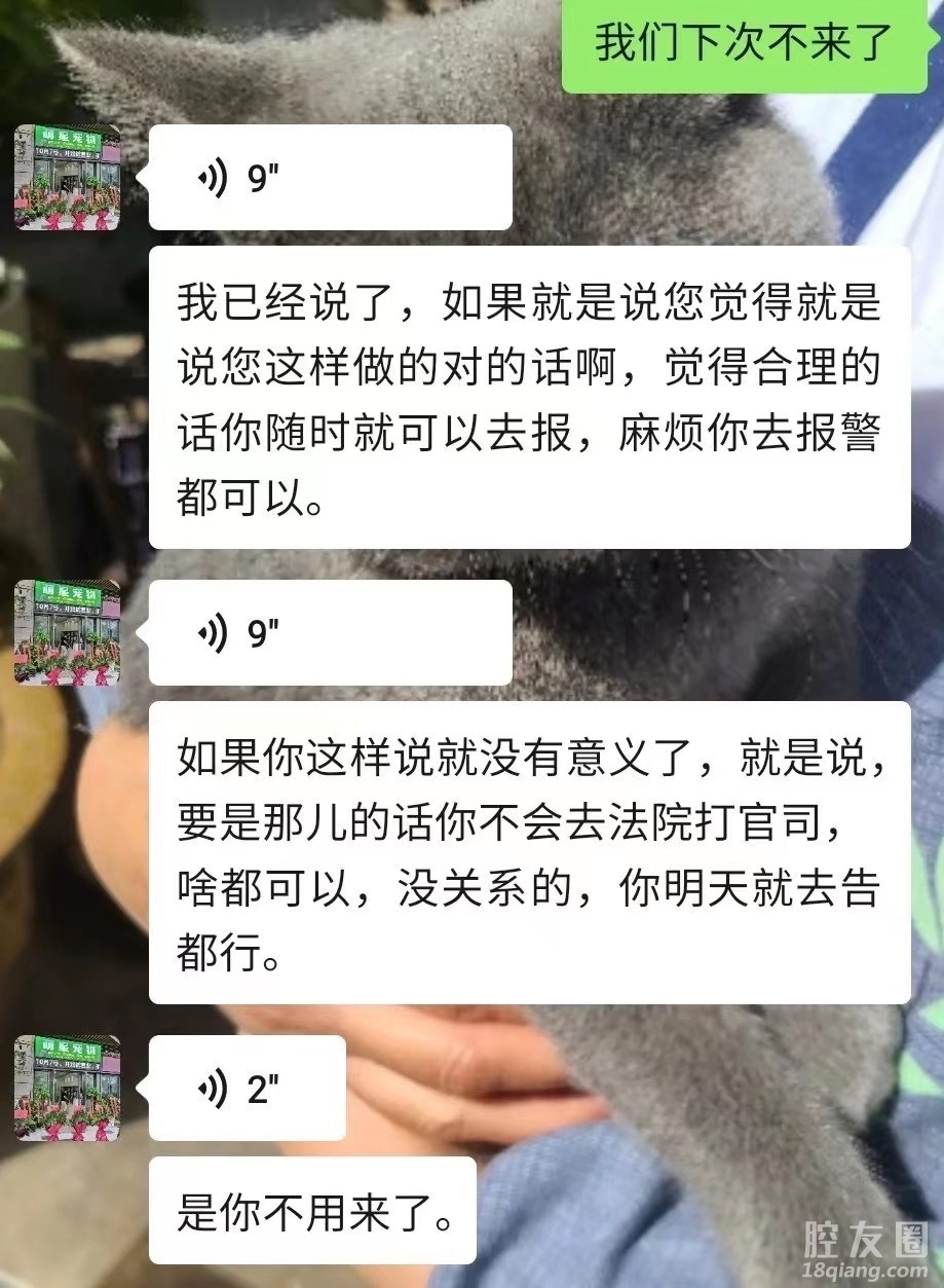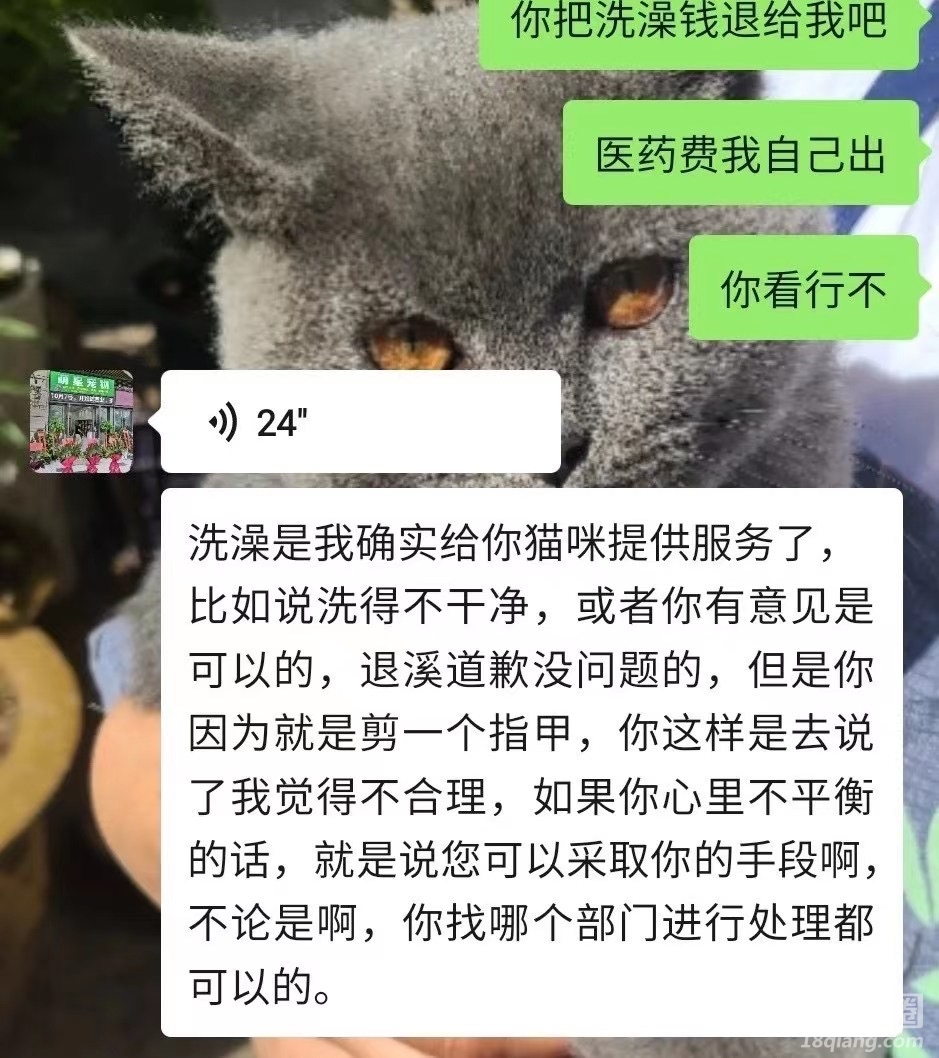 我把猫咪放在店里洗澡,人去附近觅食了,然后吃完饭高高兴兴去接洗香香的猫,然后回到家才发现把我家猫指甲剪断,找他理论,店家说根本没发现,怎么可能呢?后续找他要求处理解决一下,当时店家电话里回复:就是没把事情做好,我无话可说。后续说免费洗一次澡,再送一盒罐头+猫条,勉强同意了,后来又说不行,就如图这样的态度,叫我们报警好了,感觉和无赖没法沟通,最后把洗澡钱退给了我,其余没有任何道歉和补偿,解决事情态度非常不好!现在已经拉黑店家,朋友圈养小宠物的兄弟们别去这家,看着人模人样的店,没想到处理事情是这种态度,气死了气死了