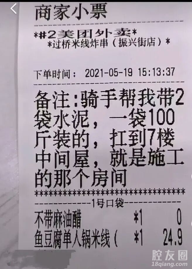 美团外卖骑手小王爆料:说前几天接到一个外卖订单一看备注当时震惊一下,以为这是客人开玩笑写的备注也没去在意,最后还是按正常送餐把外卖送了过去,当时客人也没说什么。